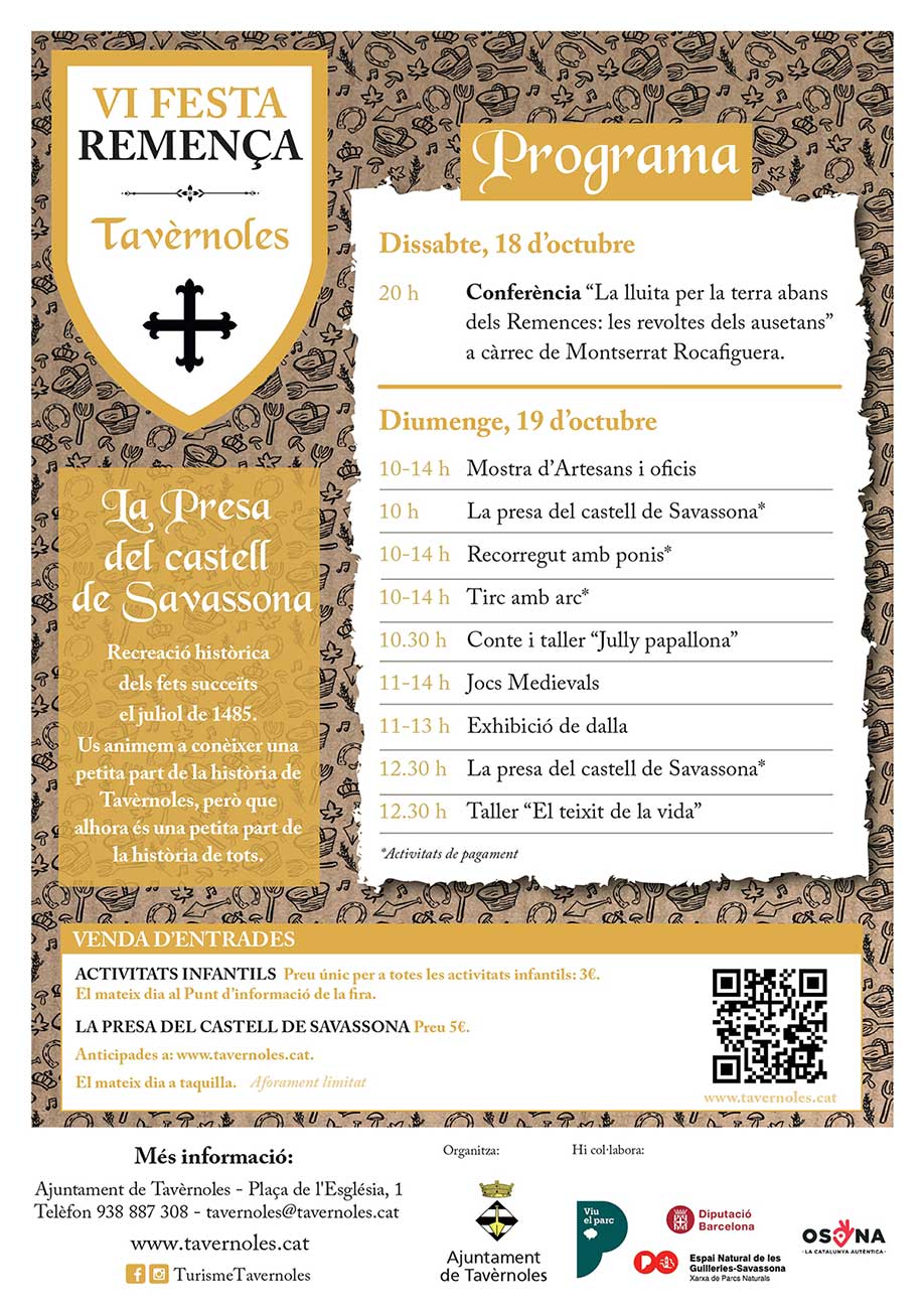 El pròxim cap de setmana 18 i 19 d’octubre Tavèrnoles acull la VI Festa Remença. La posada en escena de la representació de “La Presa del Castell de Savassona” tornarà a ser el principal atractiu.