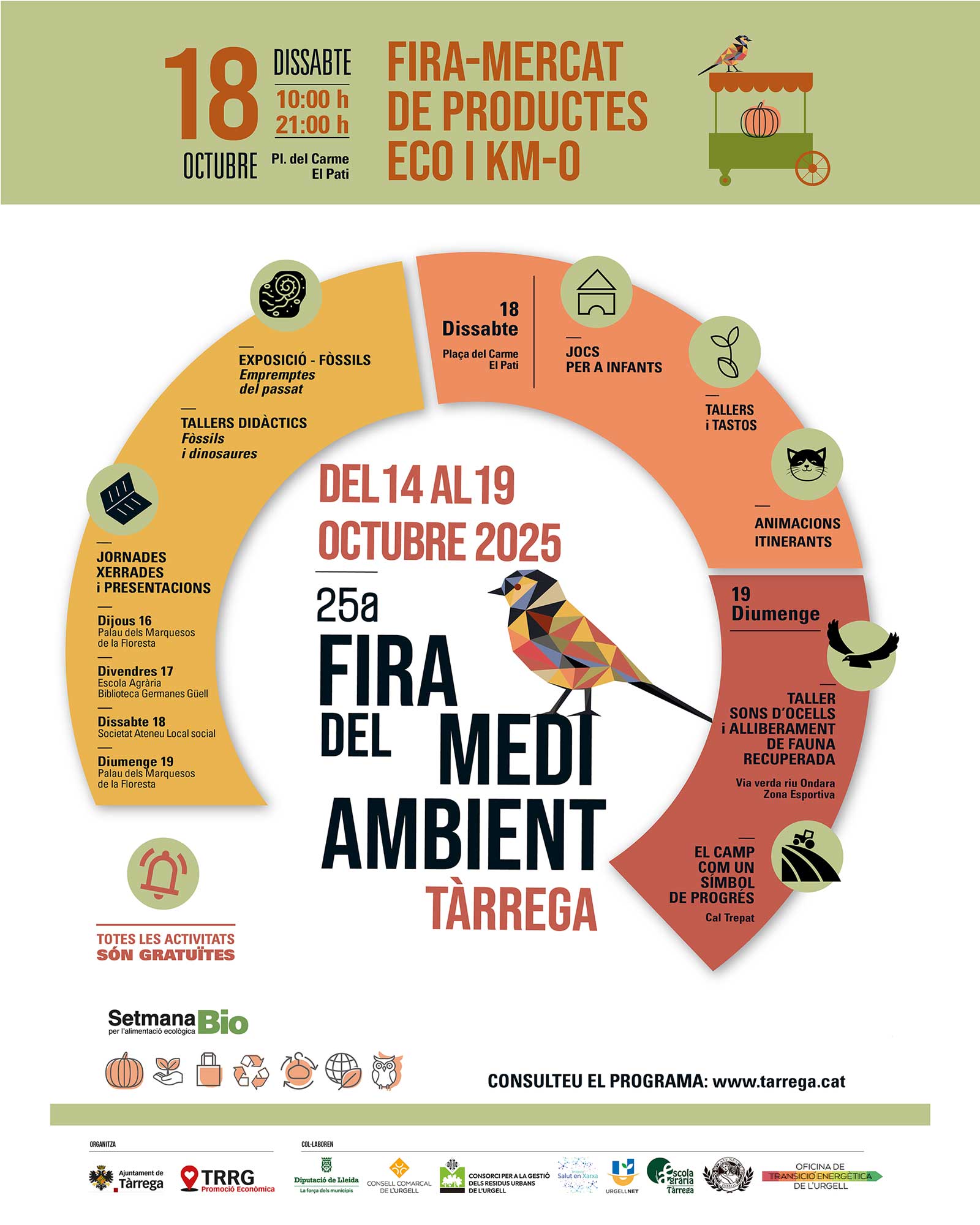 L’Ajuntament de Tàrrega, a través de la Regidoria de Promoció Econòmica, Treball i Turisme, presenta la 25a edició de la Fira del Medi Ambient. Aquest certamen consolidat, que posa el focus sobre l’alimentació de proximitat i km 0, l’estalvi energètic, el reaprofitament i el consum responsable, incorpora diverses novetats, entre les quals també destaca la diversificació d’espais per tota la ciutat i un programa d’actes que busca implicar públics de totes les edats.